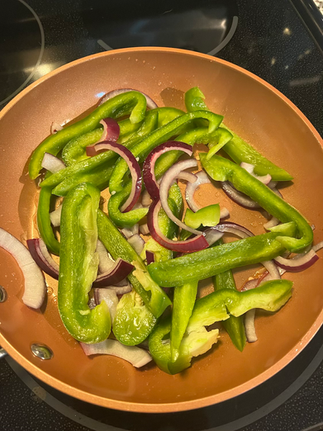 Slice your favorite veggies and sauté in a pan with a bit of avocado oil, salt and lime juice. I used green bell peppers and red onions- but corn, mushrooms, squash all great options.