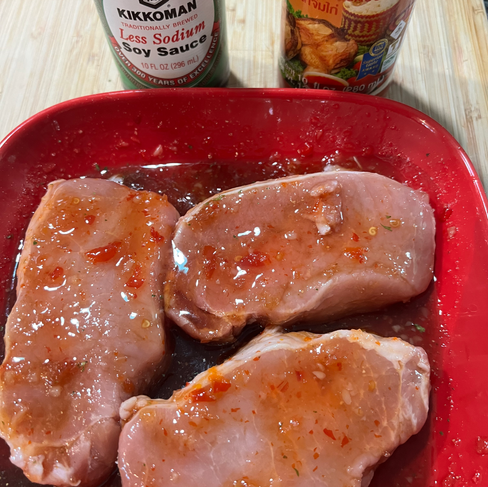 Mix Thai Sweet Chili Sauce & Soy Sauce (I use low sodium) and pour over the top of the meat, in a dish with a raised sides, and turn the chops to coat both sides. Set aside while you prep the side and rice.