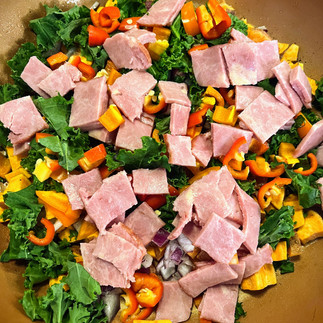 Next add the onions, bell peppers, kale and turkey bacon, spray with your favorite cooking oil, and salt and pepper to taste, and continue to sauté.