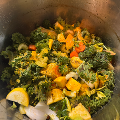 Next set the InstaPot to sauté, add the vegetables and some olive oil. Season with salt, lemon pepper, turmeric and za'atar. Add 2 cloves chopped garlic. Sauté.