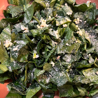 In a small sauté pan sauté 2 large handfuls of fresh spinach, a bit of olive oil, and 2 cloves of fresh garlic, sprinkle with grated parmesan, and salt.