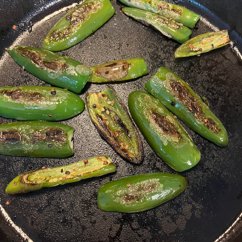 Add the chilies and tomatillos to the pan and roast on both sides (no oil needed)- until charred and softened.